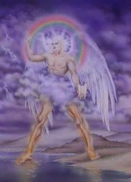 Vi descender del cielo a otro ángel fuerte, envuelto en una nube, con el arco iris sobre su cabeza; y su rostro era como el sol, y sus pies como columnas de fuego. Tenía en su mano un librito abierto; y puso su pie derecho sobre el mar, y el izquierdo sobre la tierra;